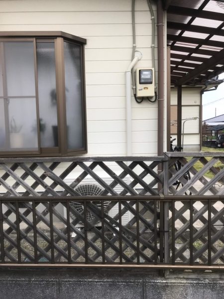 取付けを行う前から、穴がこの位置に空いていたので、この様な取付けになりました。右の画像の様に外部の壁には電気メーターが付いています。様々な理由からこの穴の位置になったのではと推測されます。外部には配線も通っているので、全てカバーが取付け出来ないので、もともと付いていたストレートの部分だけ